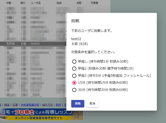 この時、挑戦持ち時間条件がなんであっても、中断局の持ち時間条件に自動的に設定される。