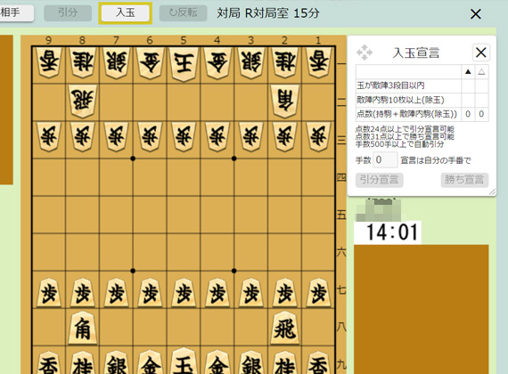 →OKの場合は入玉宣言ウィンドウにチェック「v」 - 点数(持駒+敵陣内駒(除玉))によって、宣言が可能。