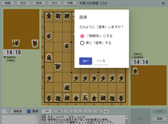 - 相手接続切れなどで中断したら、1分半待ち、判定あるいは中断のまま残すか決める。