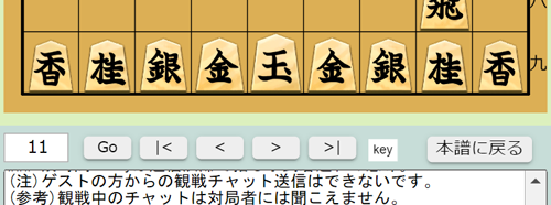 - 棋譜選択や「戻る< 」「進む>」「本譜に戻る」ボタンで局面を変更した場合は、2~3秒のタイムラグを設定しています。また、2~3秒以内に、再度局面を変更した場合、変更した時点から2~3秒後に伝達されます。