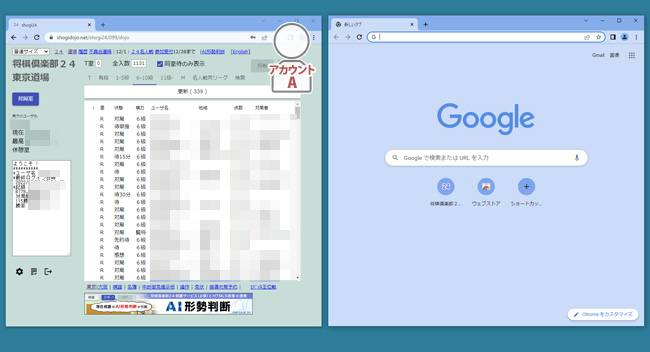 (4)(3)で開いた新規ウィンドウでも将棋倶楽部24を開き、2つ目のアカウント(アカウントを複数持っている場合)、もしくはゲストログインで道場にログイン