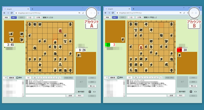 - (将棋盤右下の<>マークを押して入場者リストを非表示にすると分かりやすい)