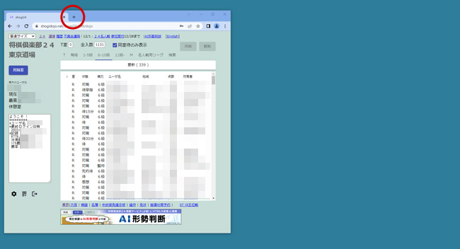 (1)観戦や対局待ちしているタブ横の+マークをクリックし、新規タブを作成